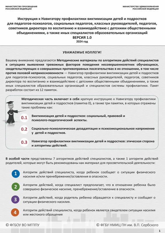 В 2024 году эксперты факультета «Юридическая психология» ФГБОУ ВО МГППУ и ФГБУ «НМИЦ ПН им. В.П. Сербского» Минздрава России разработали Методические материалы по алгоритмам действий специалистов в ситуациях выявления тревожных факторов поведения несовершеннолетних обучающихся, свидетельствующих о совершаемых противоправных посягательствах в их отношении, в том числе против половой неприкосновенности — «Навигатор профилактики виктимизации детей и подростков» (для педагогов-психологов, социальных педагогов, классных руководителей, советников директора по воспитанию и взаимодействию с детскими общественными объединениями, иных педагогов и специалистов образовательных организаций, а также других специалистов системы профилактики безнадзорности и правонарушений несовершеннолетних).