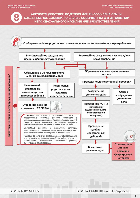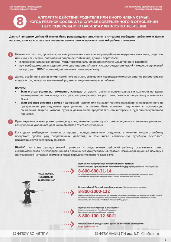 8. Алгоритм действий родителя или иного члена семьи, когда ребенок сообщил о случае совершенного в отношении него сексуального насилия или злоупотребления.